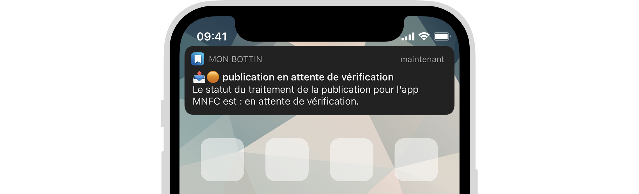 - Quelques instants plus tard vous recevez une notification ainsi qu'un email indiquant que le traitement de votre publication est en attente de vérification.
